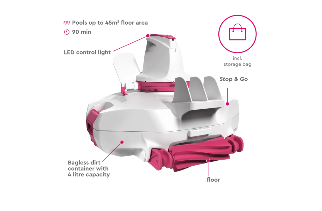 Geen stroomaansluiting of kabel nodig in de buurt van het zwembad, oplaadbare batterij met looptijd tot 90 minuten.