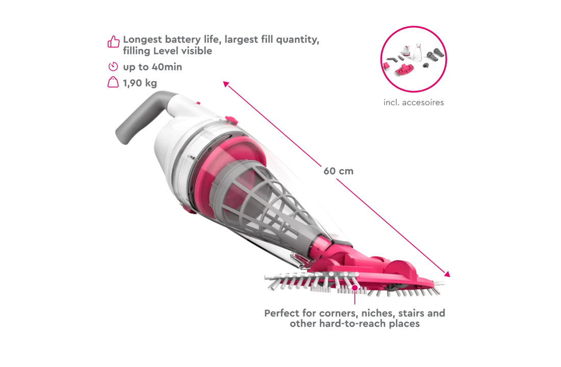 Zwembadstofzuiger, oplader, 2 filterinzetstukken en hoekborstel met 2 jaar garantie.