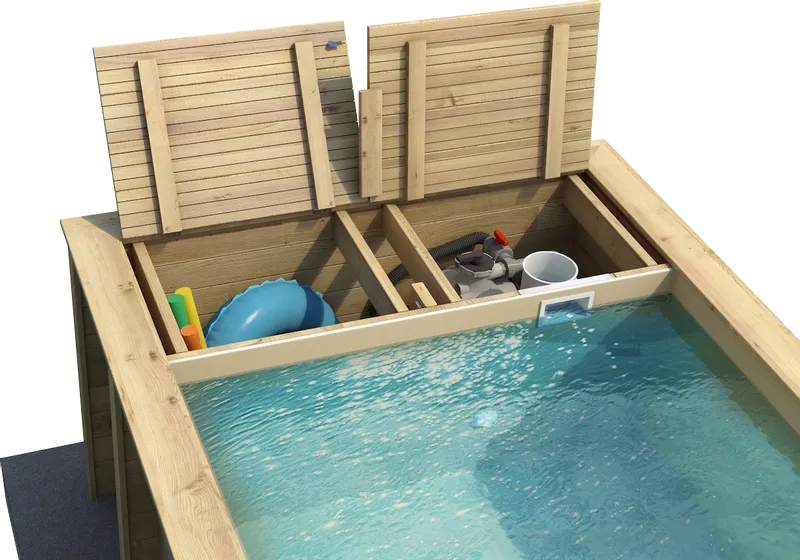 De Pool ‘n Box is uitgerust met een handige opbergbox aan de korte zijde. De geïntegreerde opbergbox is gemaakt van hetzelfde houtsoort als het zwembad en het profiel is gelijk aan de boordplanken zodat dit een mooi geheel vormt. Voor de optimale veiligheid is de box voorzien van een gevertificeerd veiligheidsslot. Naast speelgoed, luchtbedden en handdoeken kun je in de opbergbox ook al het randapparatuur netjes wegwerken.